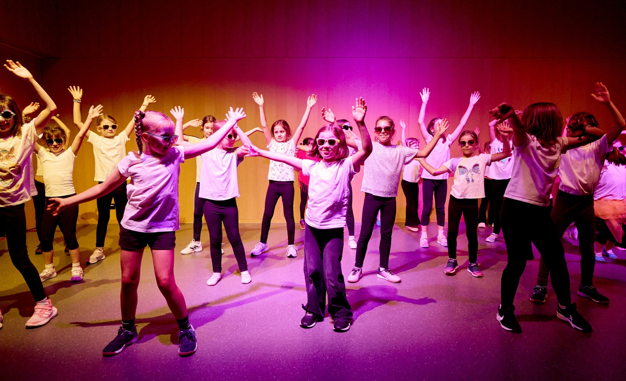Die Kinder und Jugendlichen tanzen zu Live-Klaviermusik.